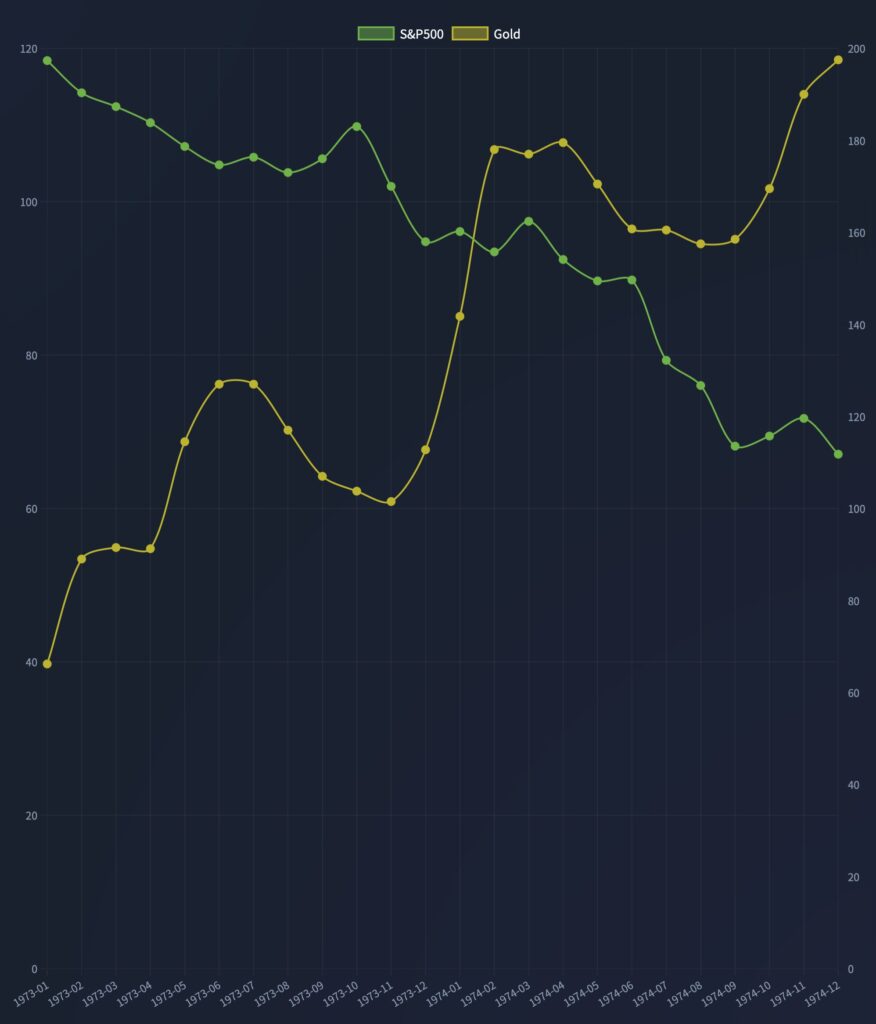 世界中の投資家がパニックに陥り、株価が半分近く吹き飛ぶような大暴落の最中において、金は下落するどころか、すべての局面で力強く上昇しているのです(オイルショック時に至っては約3倍に高騰しています)。